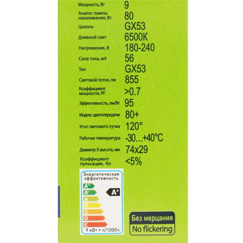 GX53, 9 Вт, 855 лм, 6500 K, 180-240 В / 50 Гц, в комплекте: 1 шт