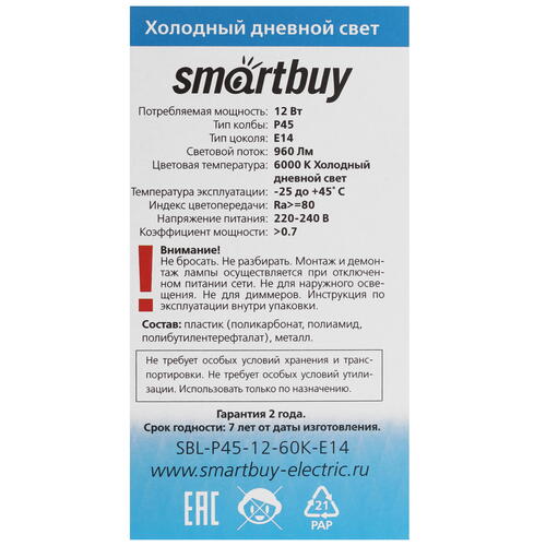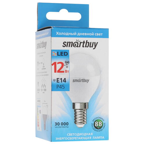 Лампа светодиодная Smartbuy SBL-P45-12-60K-E14 с колбой в виде шара использует для подключения цоколь E14. Она работает от сети 220-240 В / 50 Гц. Излучая поток света 960 лм, модель подходит для создания основного освещения.