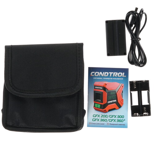 Корпус прибора устойчив к повреждениям и неблагоприятным воздействиям. Прорезиненные и силиконовые накладки гарантируют комфортное удержание без выскальзывания. Благодаря мощным магнитам, специальному пазу, петле на корпусе и резьбовому элементу предусмотрено 4 варианта установки нивелира. CONDTROL GFX300 поставляется в наборе с литий-ионным аккумулятором, зарядным кабелем, кабельной стяжкой и чехлом.