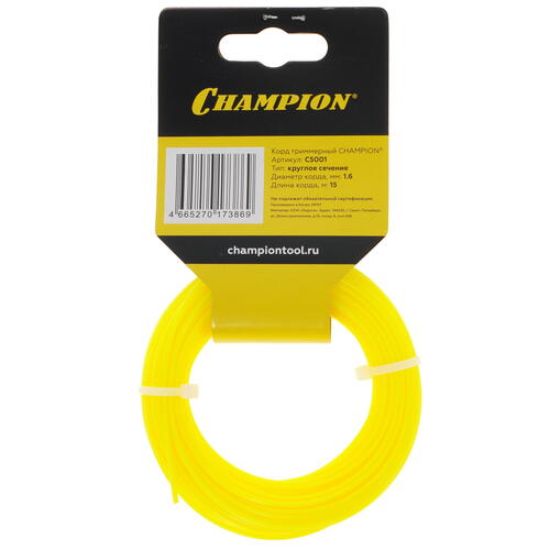 Леска для триммеров Champion Round C5001 имеет длину 15 м. Диаметр корда – 1.6 мм. Форма поперечного сечения лески – круг. Такое оснащение считается универсальным, но наилучшим образом «круглый» корд подходит для скашивания молодой травы. Преимуществом лески с круглым сечением является высокая износостойкость.