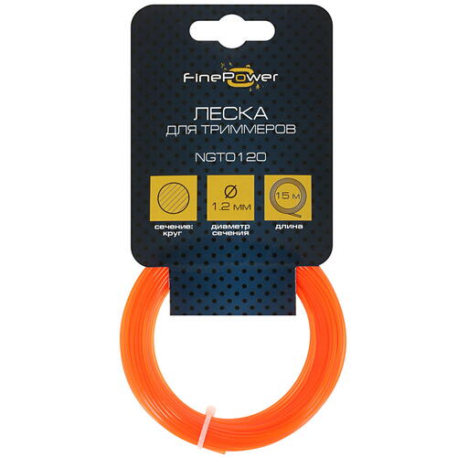 Диаметр сечения лески FinePower NGT0120 1.2 мм. Это говорит о возможности ее использования с электрическими триммерами, обладающими мощностью на уровне 500 Вт. Такой инструмент идеально подходит для стрижки травы с целью ухода за газоном. Леска представлена в стандартной фасовке – в виде мотка, содержащего леску длиной 15 м. Изделие изготовлено из пластика и окрашено в оранжевый цвет.