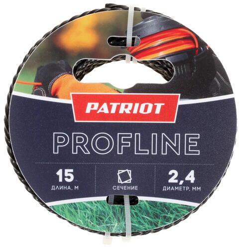 Длина лески Patriot Profline 805402206 – 15 метров. Ее поставка осуществляется на катушке, которая способствует комфортной транспортировке и удобному хранению материала. Сечение у лески витой квадрат, а диаметр у нее – 2.4 мм.
