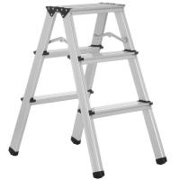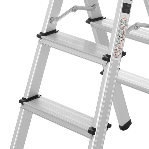 Стремянка двухсекционная FinePower F003 оснащена тремя ступенями на каждой стороне с рифленой фактурой для защиты от скольжения. На опорных ножках есть накладки для лучшей устойчивости лестницы на гладком полу. Конструкция из алюминиевого сплава выдерживает нагрузку до 150 кг. Анодированная поверхность устойчива к появлению царапин и коррозии.