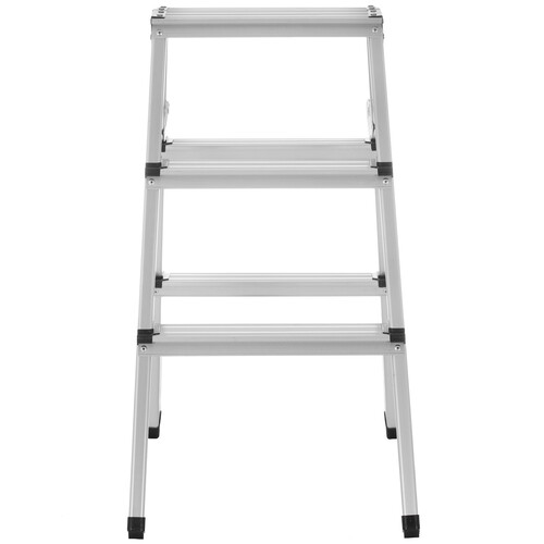 Двустороннюю стремянку FinePower F003 весом 2.1 кг легко перемещать по площадке. В сложенном виде лестница обладает размерами 76x31x16 см для удобства хранения в узком пространстве. Площадка расположена на высоте 71 см от пола. Это позволяет работать на высоте до 2.41 м в зависимости от роста человека.