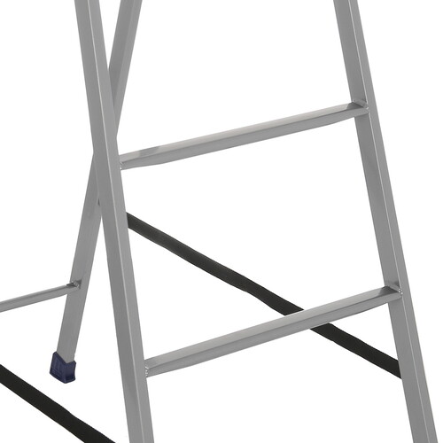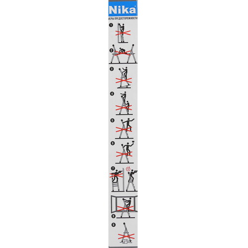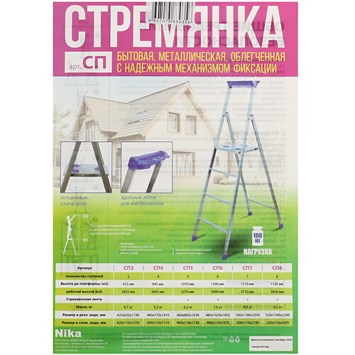Стремянка односекционная Ника СП5 сделана из пластика и стали. Антикоррозийное покрытие защищает металл от разрушения при эксплуатации во влажной среде. Для удобства размещения инструментов в конструкции предусмотрен лоток. В сложенном состоянии длина лестницы 174 см, а глубина 11 см. В таком положении ее будет удобно хранить в подсобке или перевозить в машине. На опорах есть пластиковые колпачки. Они защищают от скольжения и предотвращают повреждение пола. Элементы лестницы соединены страховыми стяжками. Они предотвращают падение с высоты.