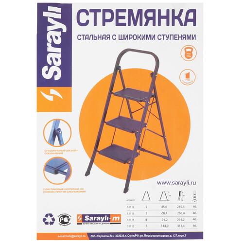 Стремянка односекционная Sarayli S1112 оснащена двумя широкими ступенями для удобного подъема и спуска. Стальная конструкция выдерживает нагрузку до 150 кг. Стремянка с рабочей высотой 220 см в сложенном виде обладает длиной 85 см.