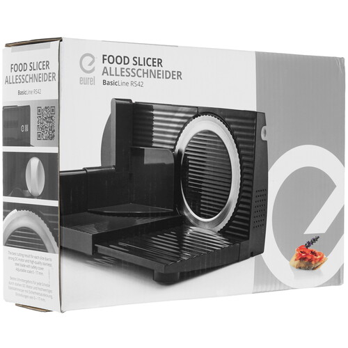 Ломтерезка Eurel RS42 черного цвета обеспечит нарезку продуктов на ломтики толщиной до 17 мм. Модель обладает мощностью 100 Вт и способна непрерывно проработать до 5 минут без риска перегрева двигателя. Компактность при хранении прибора гарантирует складной корпус из пластика. Скользящие пластиковые салазки перемещаются вместе с продуктом для аккуратной и точной нарезки. Острый нож диаметром 170 мм с волнообразной заточкой выполнен из нержавеющей стали. Устойчивость 1-скоростной ломтерезки Eurel RS42 на любой поверхности обеспечивает противоскользящее основание.