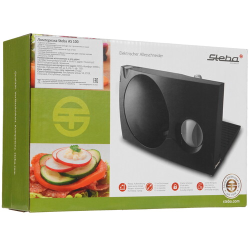 Steba AS 100 сокращает время на приготовлении холодных закусок. Устройство также позволяет делать заготовки для сушки фруктов и засолки овощей. Нож модели имеет волнообразную заточку. Это делает прибор удобным для нарезания продуктов с неоднородной структурой ‒ хлеба, помидоров, цитрусовых. Такой нож не подходит для нарезки мягкого сыра: он прилипает к его поверхности. Скользящие салазки модели перемещаются в процессе нарезки вместе с продуктом, что повышает аккуратность и точность нарезки.