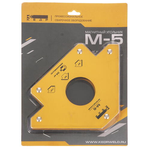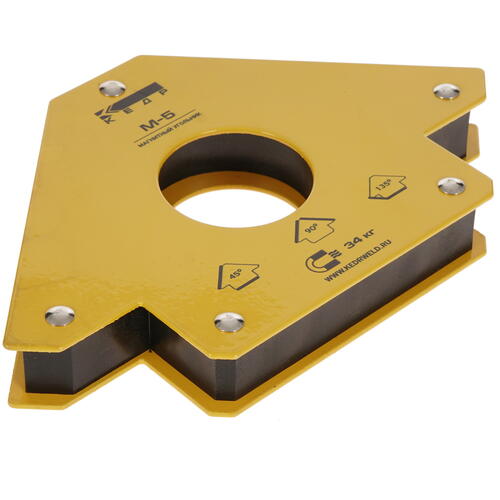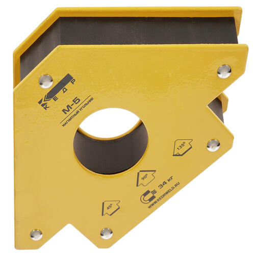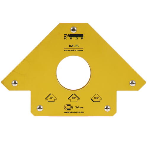 Магнитный угольник КЕДР М 5 с окрашенным в желтый цвет корпусом оснащается магнитами и находит применение при сварочных работах, позволяя зафиксировать стальные детали под определенным углом друг к другу. Изделие фиксируется на поверхности стальных заготовок, подготовленных к свариванию, и позволяет расположить их под углом 45, 90 или 135 градусов относительно друг друга. Угольник отличается удобством применения и легко удаляется с поверхности деталей после использования.