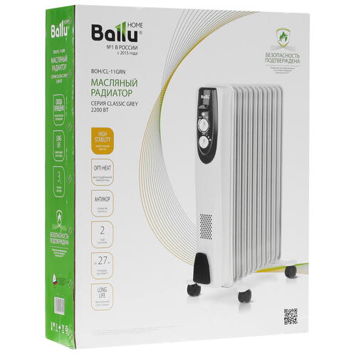 Масляный обогреватель Ballu Classic grey BOH/CL-11GRN с классическим белым корпусом хорошо смотрится дома и в офисе. Небольшие размеры позволят разместить радиатор вдоль стены или под окном. Удобная ручка с колесиками позволяют без проблем перемещать обогреватель между комнатами.