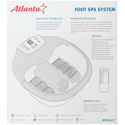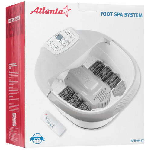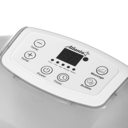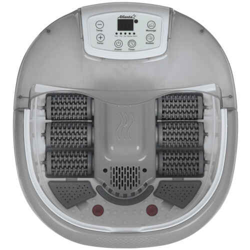 Массажная ванночка Atlanta ATH-6417 оснащена 3 режимами: акупунктурный, вибромассаж, пузырьковый массаж. Технология инфракрасного нагрева с керамическим элементом поддерживает температуру воды. На верхней панели расположены кнопки и цифровой дисплей. С помощью таймера программируется определенное время работы.