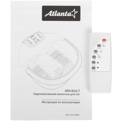 Массажная ванночка Atlanta ATH-6417 поддерживает удаленное управление с пульта. Благодаря прорезиненным ножкам на основании она прочно фиксируется на поверхности и не смещается. Козырек на корпусе предотвращает разбрызгивание воды в процессе пузырькового массажа.