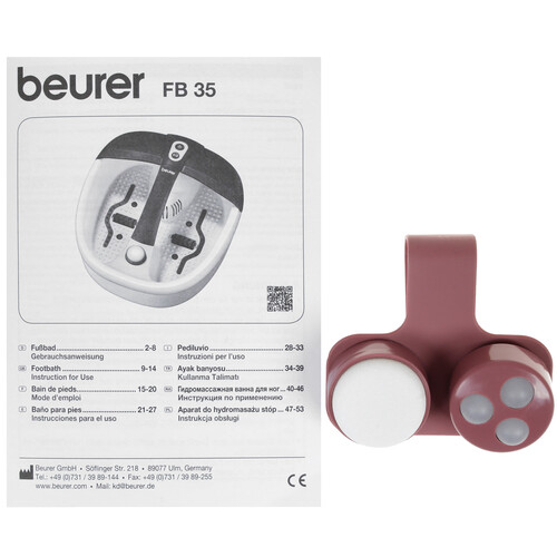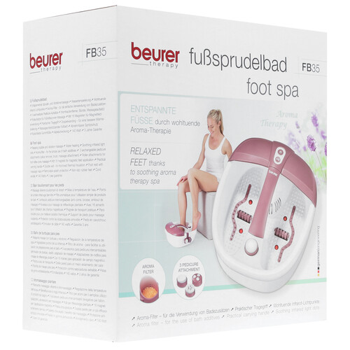 Насадками ванночки являются массажные шарики, ролики, щетка. Модель имеет опцию инфракрасного подогрева, поддержания температуры воды, возможность добавления масел и солей. Для последнего имеется встроенный фильтр. В конфигурацию Beurer FB35 входят 16 магнитов, акупунктурное покрытие, съемный брызговик. Стенки модели имеют двойную конструкцию.