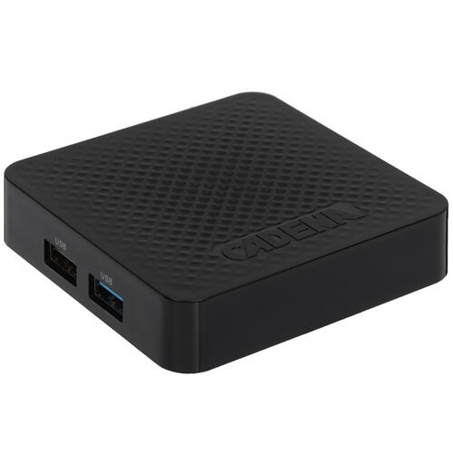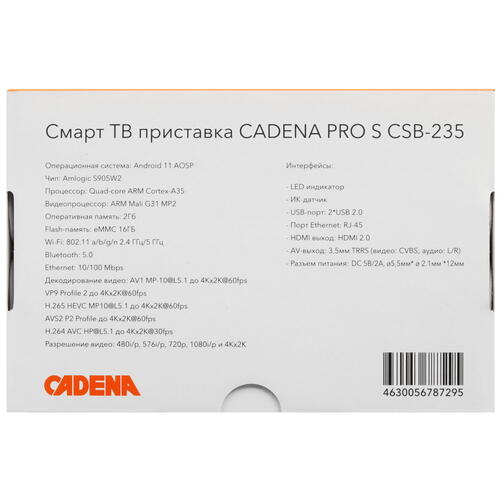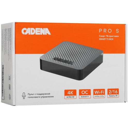 Медиаплеер Cadena PRO S CSB-235 позволяет смотреть на телевизоре видео в формате 3D и 4K. Смарт-бокс дополнен функцией HDR для увеличения яркости и контрастности изображения. Процессор ARM Cortex-A35 с ОЗУ 2 ГБ не дает системе Android 11 зависать при навигации по меню и изменении настроек. 16 ГБ встроенной памяти хватает для установки дополнительных приложений.