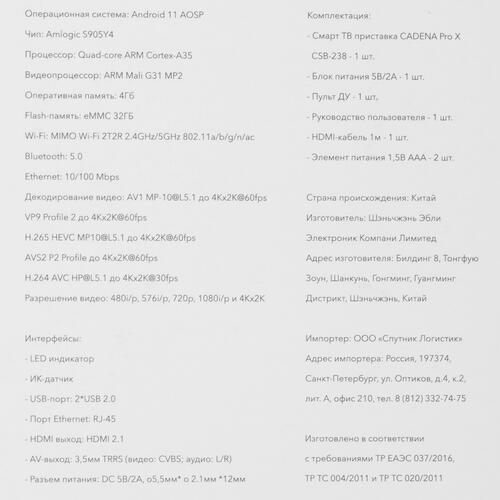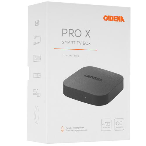 Медиаплеер Cadena PRO X CSB-238 оснащен набором интерфейсов для подключения к ТВ, работы с внешними накопителями, связи с мобильными устройствами. Вы можете настраивать доступ в Интернет по LAN-порту или Wi-Fi. Процессор ARM Cortex-A35 с ОЗУ 4 ГБ не дает системе зависать при сложных запросах и трансляции потокового видео. 32 ГБ встроенной памяти хватает для установки разных приложений.