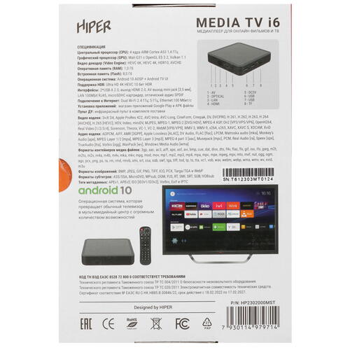 Медиаплеер HIPER MEDIA TV i6 работает под управлением ОС Android 10. Процессор ARM Cortex-A53 в сочетании с 1 ГБ оперативной памяти гарантирует отзывчивость системы при обработке задач. В комплекте поставляется пульт ДУ для управления параметрами на удаленном расстоянии.