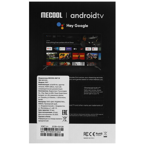 Медиаплеер Mecool KM7 SE — устройство для передачи потокового видео в разрешении 2160p 4K UHD, работает на базе роцессора Amlogic S905Y4 Quad core ARM Cortex-A35, поддерживает формат AV1 HDR. Модель поставляется с предустановленными приложениями для просмотра контента от популярных потоковых сервисов. Устройство оснащено 2 ГБ оперативной памяти DDR4 и 32 ГБ встроенной памяти eMMC для хранения приложений, данных и медиафайлов.