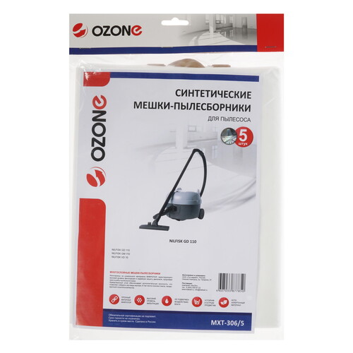 Мешки Ozone MXT-306/5 поставляются в количестве 5 штук. Упаковку, размеры которой составляют 260x400x20 мм, несложно хранить. Масса мешков в упаковке составляет 370 г. На упаковке размещена полная информация о свойствах мешков.