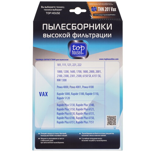 Top House THN 201 Vax совместим с разными моделями моющих пылесосов VAX. Пылесборники обладают влагостойкой многослойной конструкцией. Все мешки оснащены жесткими вставками для плотного прилегания к отверстию трубы всасывания и защиты от попадания пыли на внутренние поверхности устройства.