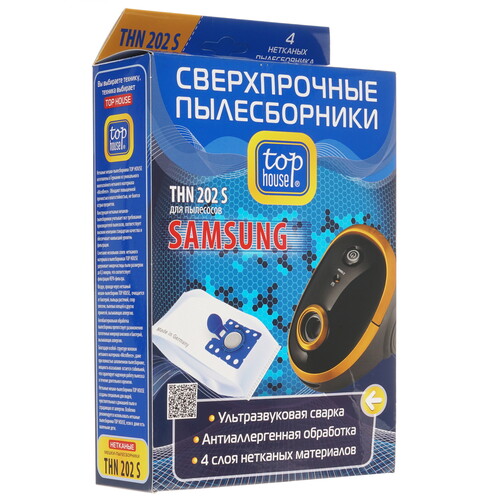 Мешок-пылесборник Top House THN 202 S предназначен для совместного применения с пылесосами производителей Samsung. Благодаря применению 4-х слоев на основе нетканных текстильных материалов пылесборник одновременно отличается высокой эффективностью фильтрации и хорошими прочностными свойствами. Ультразвуковая обработка повышает устойчивость к повреждениям и износу. Высокая степень очистки поддерживается при любом уровне заполнения. В наборе поставляются 4 сменных пылесборника с удобными пластиковыми клапанами. Среди других особенностей Top House THN 202 S отмечается специальная антибактериальная обработка.