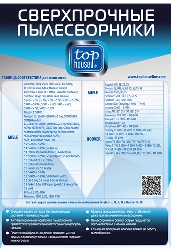 Мешок-пылесборник Top House THN 309 M предназначен для использования с пылесосами от производителей Hoover и Miele. Он изготовлен из нетканного синтетического материала, благодаря чему отличается высокой эффективностью фильтрации воздуха, тщательной задержкой частиц пыли и устойчивостью к различным неблагоприятным воздействиям. Одной из особенностей Top House THN 309 M является антибактериальная обработка, что помогает предотвратить распространение бактерий и микроорганизмов. Пластиковый фланец и ультразвуковая обработка повышают устойчивость к повреждениям. В наборе поставляются 4 сменных пылесборника.