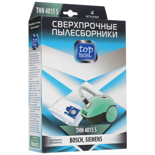 Мешок-пылесборник Top House THN 4015 S подходит для использования с пылесосами производителей SIEMENS и Bosch. Благодаря применению нетканного синтетического материала с антибактериальной обработкой мешок обеспечивает эффективную очистку от частиц пыли, бактерий, аллергенов, пылевых клещей. Материал отличается повышенной устойчивостью к повреждениям, острым предметам, влаге и другим неблагоприятным воздействиям. На мешках расположены пластиковые фланцы. В набор Top House THN 4015 S входят 4 сменных пылесборника.