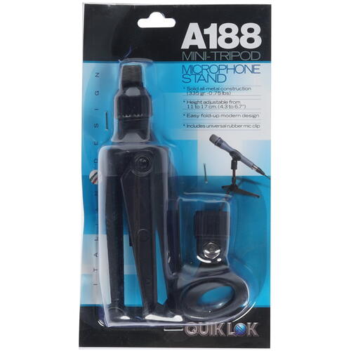 Опорой микрофонной стойки QUIK LOK A188 является складная тренога, оснащенная антискользящими накладками. Это делает ее максимально устойчивой на горизонтальной поверхности. Телескопическая регулировка высоты позволит легко зафиксировать микрофон на нужном расстоянии. При этом минимальная высота размещения микрофона составит 110 мм, а максимальная – 170 мм. Для удержания микрофона на стойке имеется держатель-прищепка. Наличие дополнительной блокировочной системы обеспечивает надежную фиксацию микрофона в нужном положении, что не даст ему отклоняться или соскальзывать.