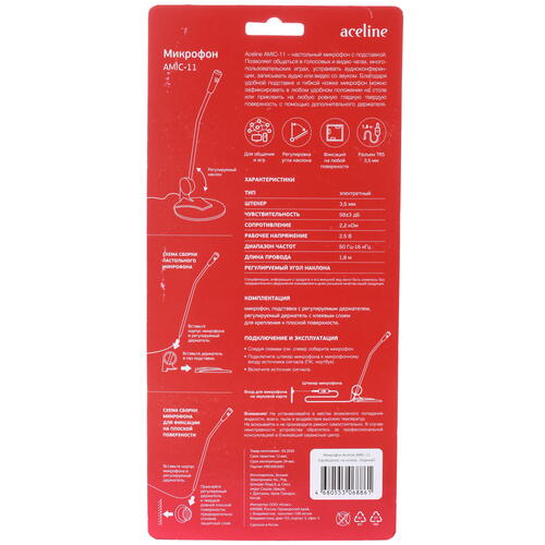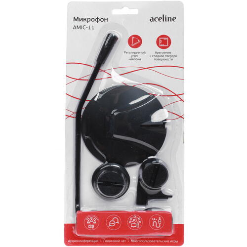Микрофон Aceline AMIC-11 относится к категории гарнитур с проводным подключением. Достоинством таких устройств считается отсутствие необходимости регулярной подзарядки. Питание происходит за счет прибора, к которому подключен микрофон, поэтому вероятность неожиданного отключения из-за разряженного аккумулятора пропадает. Длина кабеля составляет 1.8 м, что удобно даже при соединении через системный блок стационарного компьютера, который обычно располагается под столом. Предназначен Aceline AMIC-11 для общения по сети. Микрофон электретный, в нем нет зацикливания звукового сигнала, что идеально подходит для связи с друзьями или коллегами. Способ исполнения – настольный.