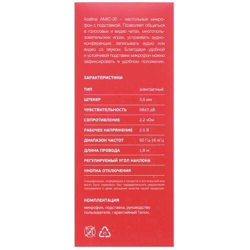Микрофон Aceline AMIC-30 обладает чувствительностью -58 дБ. Минимальный уровень передаваемых частот – 50 Гц, а максимальный – 16 000 Гц. Особенностью модели является наличие кнопки питания на корпусе микрофона.