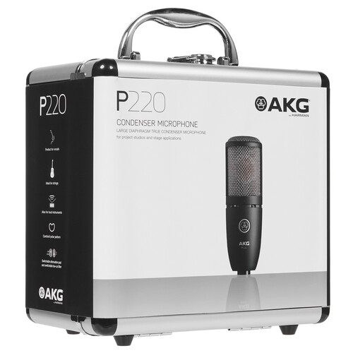 Микрофон AKG P220 формирует детализированный звук при записи вокала, духовых инструментов, акустической гитары. В нем установлен конденсаторный капсюль с кардиоидной диаграммой направленности. Наличие переключаемого фильтра низких частот и аттенюатора делают его подходящим решением для совместного использования с источниками громкого звучания. Подключение осуществляется проводным способом посредством разъема XLR. Студийный микрофон AKG P220 выполнен в прочном металлическом корпусе и предусматривает возможность подвесного крепления.