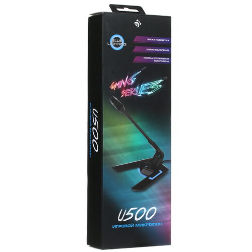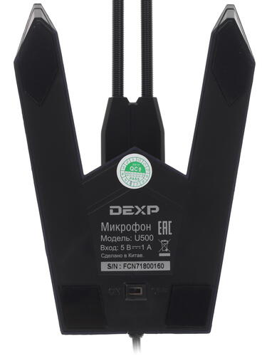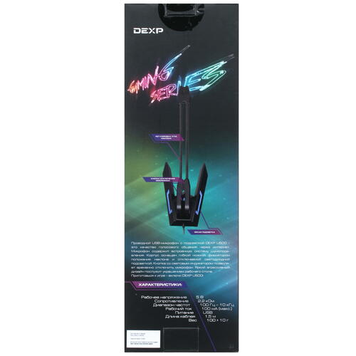 Изготовлен микрофон DEXP U500 в черном цвете, из металла и пластика. Несколько брутальный дизайн микрофона намекает на его «игровую» принадлежность. Модель имеет подсветку и встроенную систему шумоподавления. Для того чтобы на время отключить микрофон, имеется кнопка со световым индикатором.