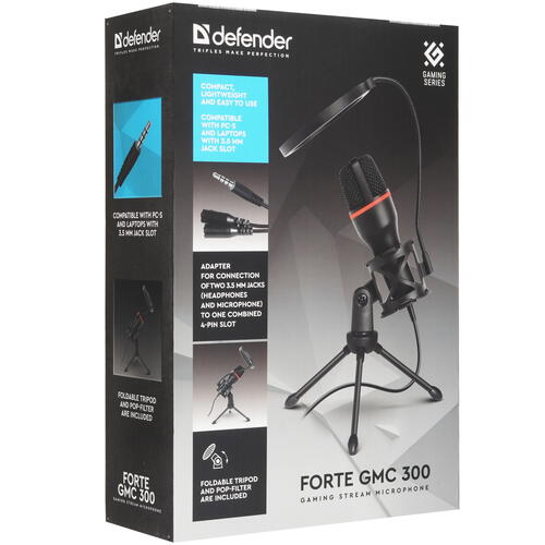 Микрофонный комплект Defender Forte GMC 300 предназначен для использования с настольными компьютерами и ноутбуками. Электретный принцип действия и всенаправленность круглой плоской мембраны позволяют точно улавливать звуки со всех сторон. Поп-фильтр обеспечивает четкость передачи голоса без посторонних окружающих шумов. В комплекте с микрофоном Defender Forte GMC 300 поставляется складная тренога с устойчивыми опорами. Для подключения к ПК предусмотрен кабель с разъемами jack 3.5 мм и 2xjack 3.5 мм.