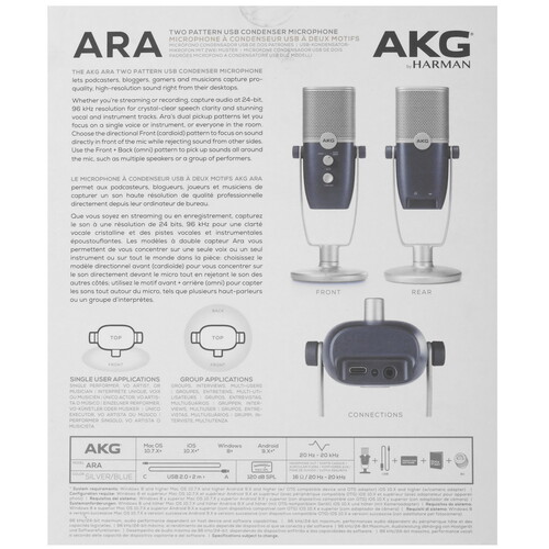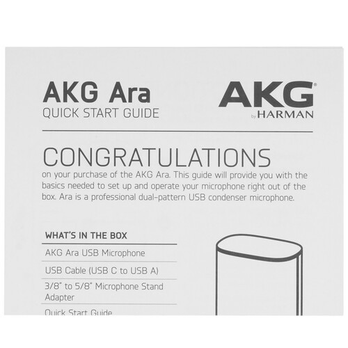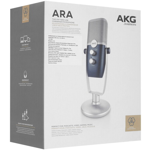 Двухдиапазонный USB-микрофон AKG Ara позволяет подкастерам, блогерам, геймерам и музыкантам записывать звук профессионального качества с высоким разрешением прямо со своих настольных компьютеров. Независимо от того, ведете ли вы потоковую передачу или записываете, захватывайте звук с разрешением 24 бит, 96 кГц для кристально чистой речи и потрясающих вокальных и инструментальных дорожек. Двойные диаграммы направленности Ara позволяют вам сосредоточиться на одном голосе или инструменте или на всех в комнате: выберите направленную фронтальную (кардиоидную) диаграмму направленности, чтобы сосредоточиться на звуке прямо перед микрофоном, отклоняя звук с других сторон; используйте фронтальную + заднюю (омни) диаграмму направленности, чтобы записывать звуки вокруг микрофона, например, от нескольких динамиков или группы исполнителей. Используйте Ara на рабочем столе, на стреле, на стойке или даже в дороге с дополнительным адаптером и вашим мобильным устройством. Это просто, «подключи и работай» благодаря подключению USB и драйверам, совместимым с классом.