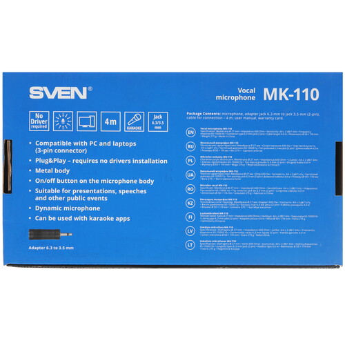Проводной микрофон SVEN MK-110 ручного типа относится к динамическому типу и имеет кардиодную направленность. Это делает устройство подходящим для занятий вокалом. Корпус микрофона сделан из металла. Чувствительность модели составляет -27 дБ, а частотный диапазон варьируется от 65 до 15000 Гц. Подключается она через разъем XLR. Для отключения SVEN MK-110 в корпусе предусмотрена кнопка. Кабель модели получил съемную конструкцию.