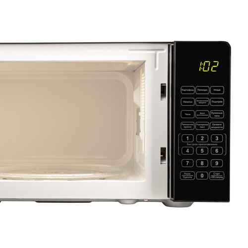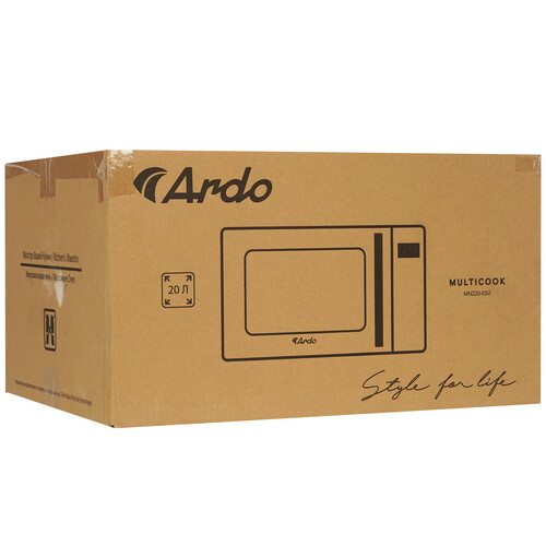 Микроволновая печь Ardo MNZ20-EB2 выполнена в металлическом корпусе черного цвета. На передней панели расположены сенсорные кнопки с обозначениями и дисплей с функцией часов. Продолжительность работы программируется при помощи таймера с обратным отсчетом. Подсветка равномерно освещает внутреннее пространство и позволяет визуально контролировать готовность блюд.