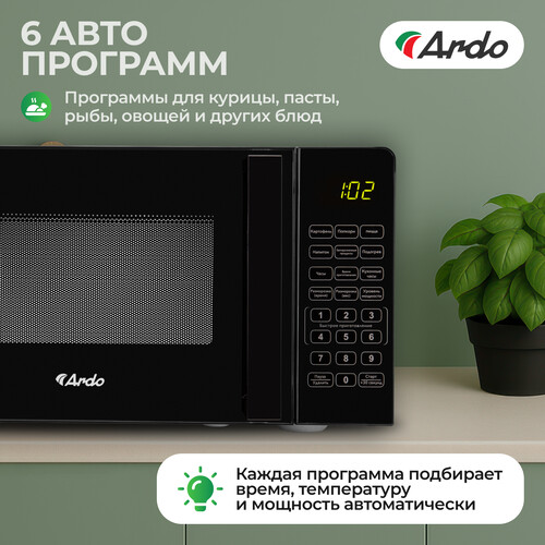 Микроволновая печь Ardo MNZ20-EB2 имеет внутренний объем 20 л. В модели реализованы автоматические программы «Картофель», «Попкорн», «Пицца», «Напиток», «Замороженные продукты», «Разморозка по весу», «Разморозка по времени». С помощью 10 уровней регулируется мощность.