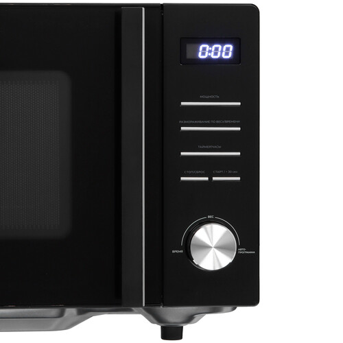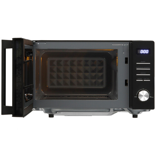Черная микроволновая печь DEXP FB-70 с внутренними стенками из простой в уходе эмалированной стали вмещает 20 л. Вы можете управлять устройством с помощью кнопок и поворотного рычага. Дисплей показывает текущее время и обратный отсчет таймера во время работы СВЧ-печи. Модель дополнена функцией включения/выключения звукового сигнала при нажатии определенных кнопок.