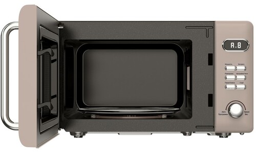 Объем камеры микроволновой печи составляет 20 литров, что создает оптимальное соотношение функциональной вместимости и компактности размещения. Конфигурация внутреннего пространства допускает использование стандартной посуды диаметром до 23 см, прямоугольных контейнеров 18×23 см, а также посуду высотой до 15 см.