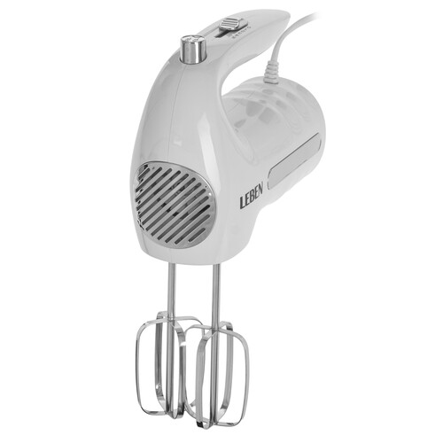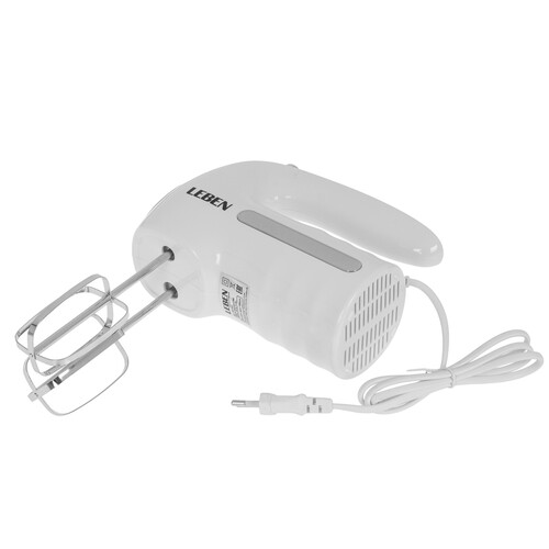 Миксер LEBEN 269-063 белого цвета мощностью 200 Вт оснащен двумя парами насадок: крюками для замешивания теста и венчиками для взбивания жидких, полужидких продуктов. 5 режимов работы позволяет плавно менять скорость и подстраиваться под любые ингредиенты и рецепты. Модель поставляется без чаши, но может использоваться с любыми глубокими кастрюлями или блюдами.