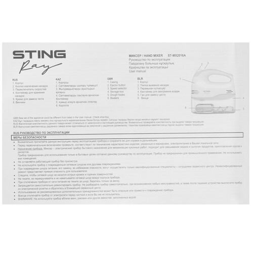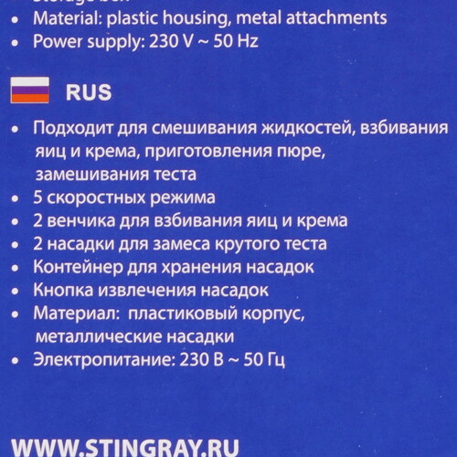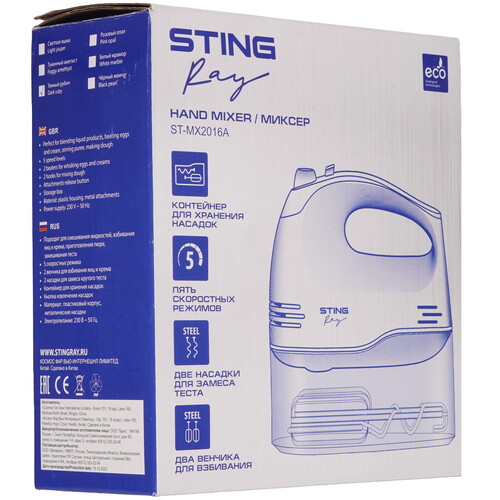 Миксер Stingray ST-MX2016A сделан из пластика и металла, на корпусе предусмотрена кнопка для отсоединения насадок, она упрощает процесс их очистки и хранения. В конструкции есть емкость для удобства хранения насадок. Вес 0.929 г и компактные размеры позволяют работать с миксером длительное время на вытянутой руке.