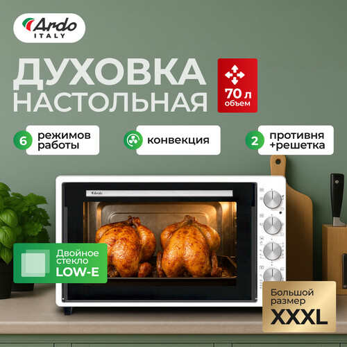 Мини печь ARDO MO7052W2 имеет внутренний объем 70 литров. Модель оснащена 5 режимами работы турбовентилятором и механическим таймером на 90 минут.