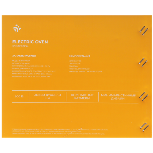 Мини-печь DEXP EO-900W оснащена телескопическими направляющими, которые обеспечивают легкое и плавное открывание и закрывание дверцы шкафа. Прибор сделан из металла, внизу имеет прорезиненные ножки для предотвращения скольжения по гладкой поверхности столешницы.