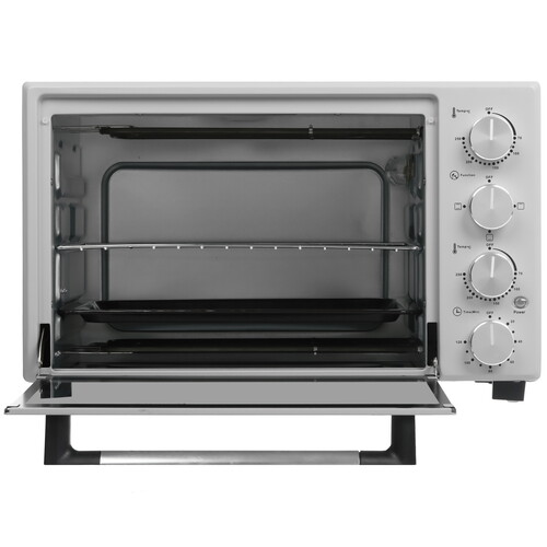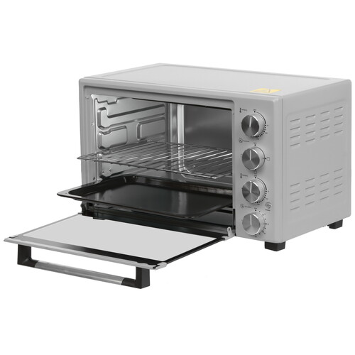 Мини-печь Kraft KFC-MO 381 HGR оснащена таймером на 120 минут. Он позволяет с точностью до минуты контролировать время окончания готовки. После завершения цикла устройство автоматически отключается и издает звуковой сигнал. Индикатор нагрева поможет вам понять, включена ли духовка или нет. В камере может одновременно располагаться решетка и противень. Это позволяет готовить два разных блюда. Благодаря прорезиненным ножкам печь не будет скользить по гладкой поверхности стола. В комплекте к модели также идет круглый противень для приготовления пирогов, запеканок.
