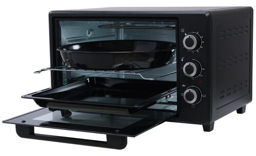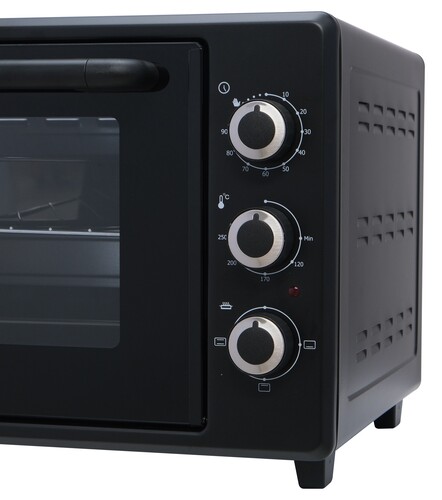 Термостойкое стекло даёт возможность контролировать ход приготовления. Внутренняя камера сделана из нержавеющей стали, которая устойчива к коррозии, перепаду температур и механическим повреждениям. Отличным подспорьем при готовке послужат: противень, решётка и круглый поднос для пиццы, идущие в комплекте. Противоскользящие ножки обеспечивают устойчивость на гладкой поверхности.