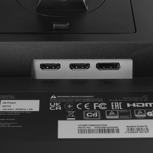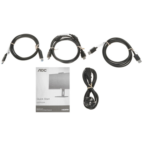 AOC Q27P3QW поддерживает разрешение 2560x1440 при соотношении сторон 16:9 для более крупного и детального изображения. Монитор устанавливается на подставку с регулировкой наклона и высоты. Ее особенность в поворотной конструкции для перевода экрана в портретный режим. На задней стороне корпуса предусмотрены отверстия, соответствующие стандарту VESA 100x100. Это дает возможность зафиксировать устройство на стене. Для подключения техники используются разъемы DisplayPort 1.2, HDMI 1.4 и USB.