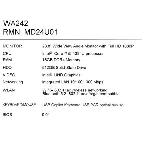 Моноблок AOPEN WA242 [ZD.D01CF.004] ориентирован на решение рабочих задач дома и в офисе. Модель оснащена 23.8-дюймовым экраном с разрешением Full HD (1920x1080). Основные компоненты конфигурации компьютера – процессор Intel Core i5-1334U и 16 ГБ оперативной памяти. Накопитель единственный – 512-гигабайтный SSD. Моноблок поставляется без операционной системы.