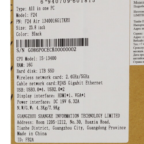 Моноблок Teclast F24 с 23.8-дюймовым экраном и разрешением Full HD оснащён процессором Intel Core i5-13400. Этот процессор имеет 10 ядер и поддерживает частоту от 2.5 ГГц до 4.6 ГГц в режиме Turbo, что обеспечивает высокую производительность для различных задач, от повседневных операций до более сложных вычислений. Устройство также включает 16 ГБ оперативной памяти DDR4, что позволяет эффективно работать в многозадачном режиме, и SSD-накопитель объёмом 1 ТБ, обеспечивающий быстрый доступ к данным и приложениям.