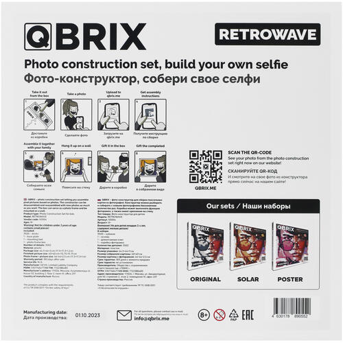 Перед тем, как собирать портрет из деталей конструктора Mozabrick Qbrix Retrowave, необходимо сделать селфи на телефон. Затем фотография загружается на сайт производителя, и вам присылают инструкцию по сборке. Это позволяет собирать конструктор по разным фото множество раз, в одиночку, с друзьями или всей семьей. Для быстрого и удобного разбора в комплекте предусмотрен демонтажный ключ. Получившееся изображение имеет размер 440х440 мм.