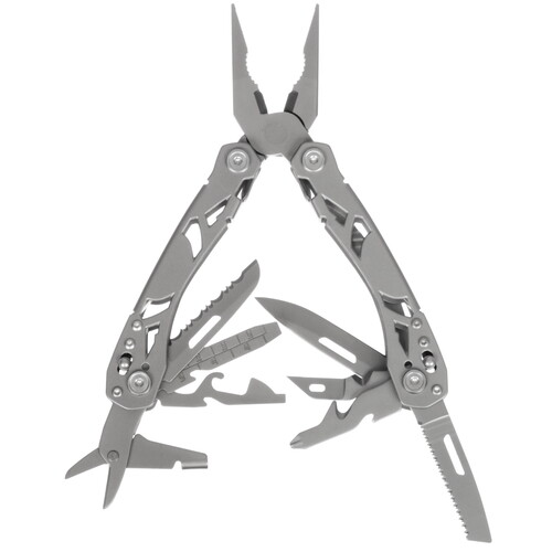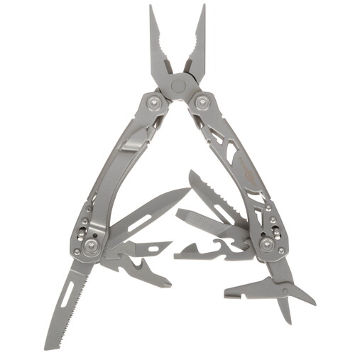 Мультитул FinePower MFT-PL102 объединяет в одном компактном устройстве 18 инструментов. Прибора поможет вам открыть консервную банку, откусить и зачистить провода, завернуть шуруп или открыть бутылку. С помощью ножа-серрейтора можно резать веревку и другие волокнистые материалы. Пила по дереву позволит подрезать ветку, а шило сделать отверстие в коже, картоне.