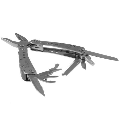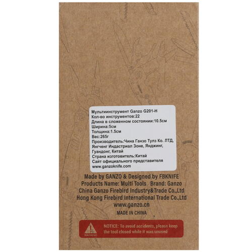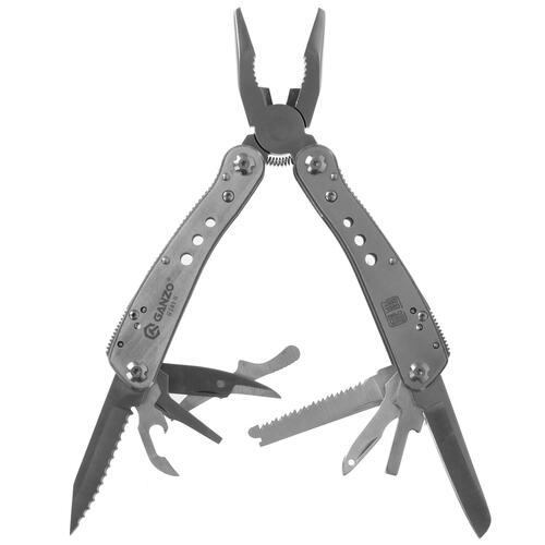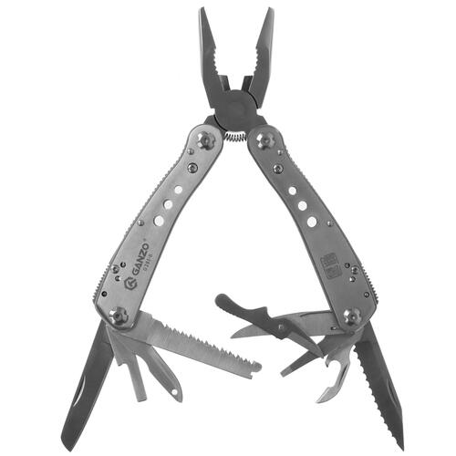 Устройство Ganzo G201-H можно использовать, как нож или открывалку, плоскогубцы, кусачки и шило, захватывать гайки и цилиндры. Мультитул оснащен набором компактных отверток и бит, упрощая работу в труднодоступных местах. Инструмент дополнен пружинящим механизмом, не дающим лезвиям раскрыться в кармане или сложиться при работе.
